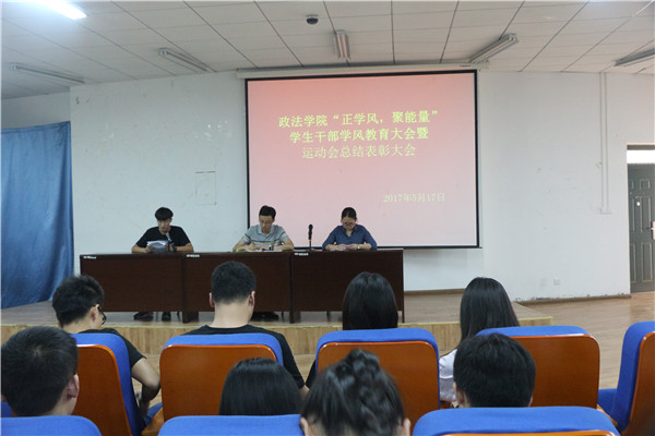 5月17日12时,政法学院“正学风,聚能量”学生干部学风教育大会暨运动会总结表彰大会在政法楼112教室举行,党总支部副书记金亮,分团委书记张宏英出席了本次大会。