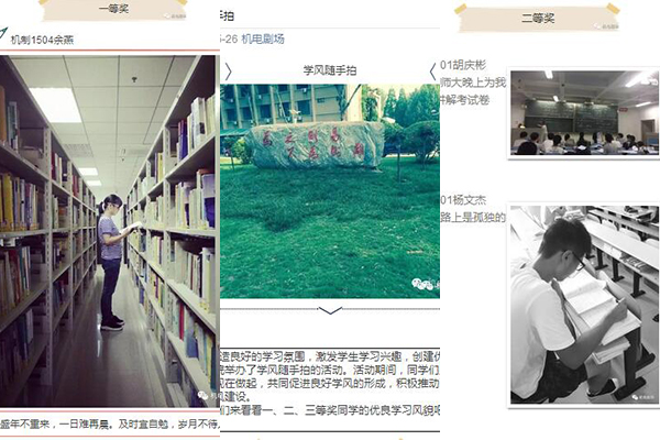 活动期间,各班级广而宣传,同学们积极参与,与大家分享学习中美的瞬间。各班级汇总上交照片,经初步筛选上报参加评比照片,学生会成员每天整理照片,并公布出来与大家分享。通过最后的评选,负责人员将最美学风照片的一部分在微信公众号“机电剧场”上进行展示,让美的瞬间定格在孜孜求学的学子心中。