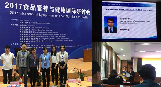 2017年5月26~28日,由大连工业大学主办,国家海洋食品工程技术研究中心、郑州轻工业学院等单位承办的“2017食品营养与健康国际研讨会(2017 International Symposium on Food Nutrition and Health, 2017 ISFNH)在中国大连召开。会议特邀美国爱荷华州立大学、美国明尼苏达大学、西澳大利亚大学、加拿大农业与农业食品部、美国肯塔基大学、美国马萨诸塞大学、西班牙埃斯特雷马杜拉大学和日本北海道大学等世界著名食品科学领域研究机构的多位专家学者,围绕食品营养与健康进行学术交流及探讨,同时针对未来的科技合作及交流平台建设进行对话,为推动食品营养与健康领域科技进步打下坚实基础。我校食品与生物工程学院院长白艳红教授带领5名青年骨干教师参加了本次研讨会。望运滔博士在青年学者论坛作了题为“New research about chitin in the field of food science”的主题报告。