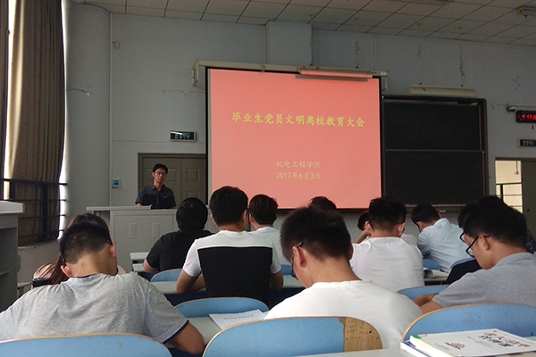 为了进一步加强我院毕业生文明离校工作,充分发挥党员模范带头作用,2017年6月3日,机电工程学院在教三楼301教室召开毕业生党员文明离校教育大会。我院学生党支部书记、全体毕业生党员参加了大会。