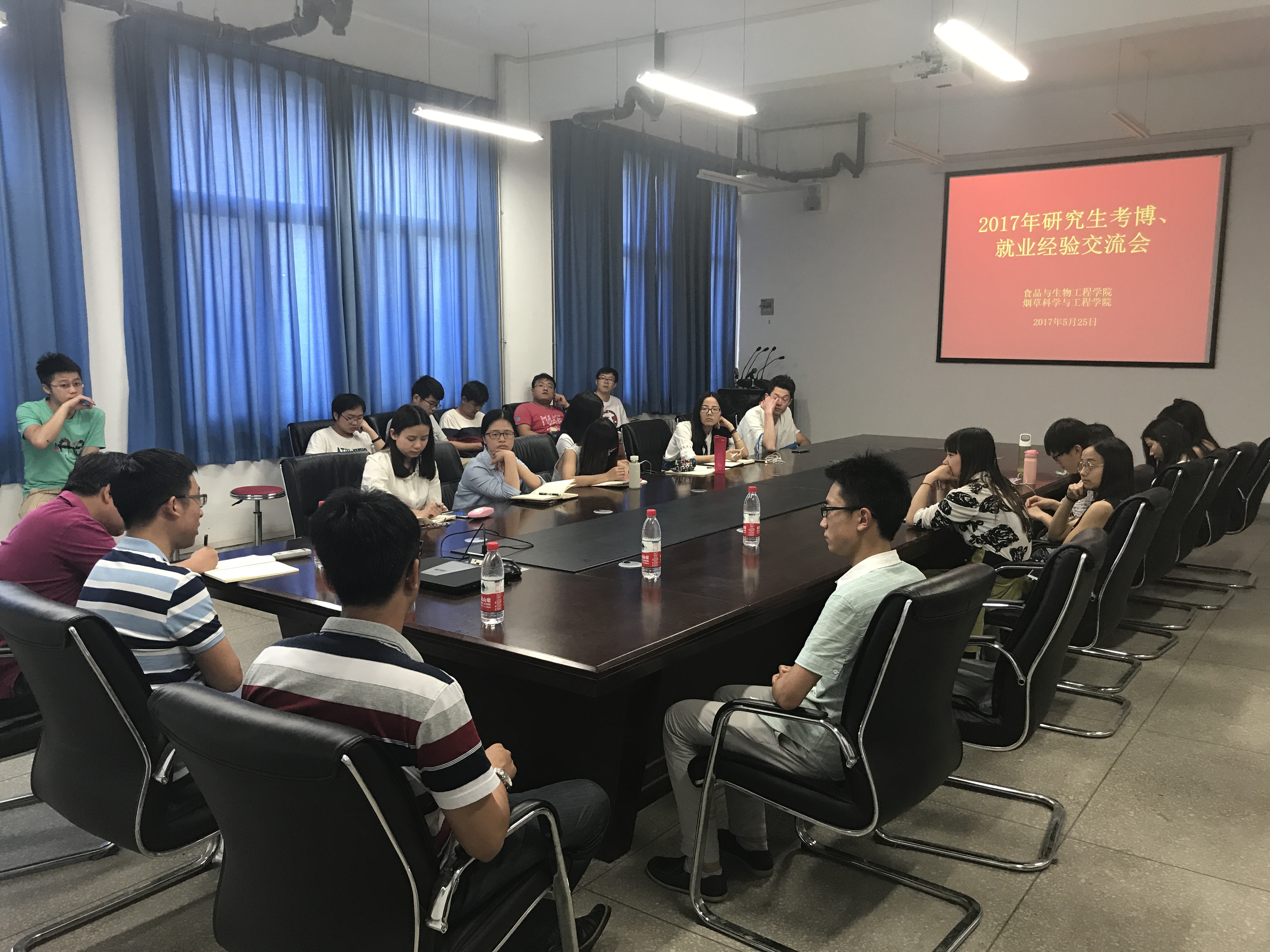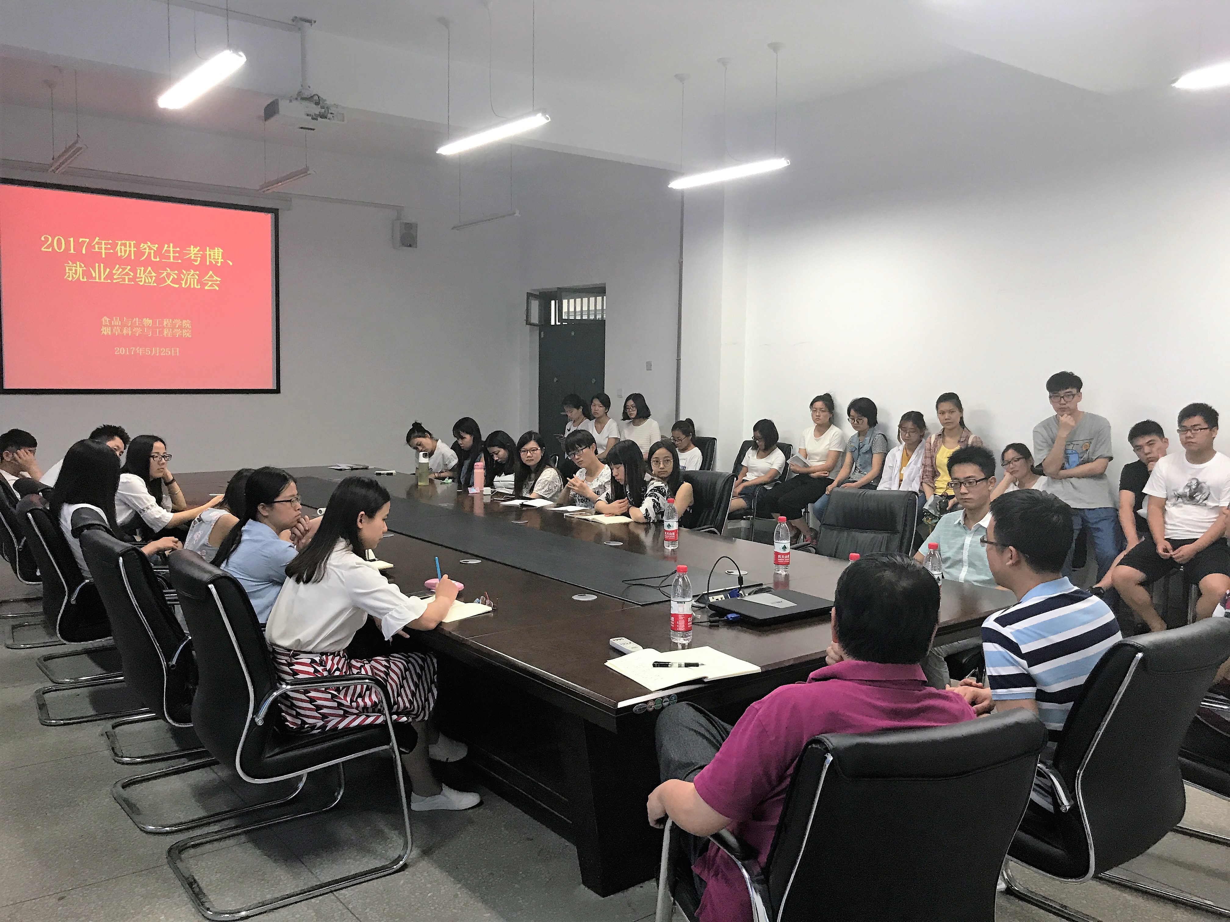 2017年6月6日,食品与生物工程学院(烟草科学与工程学院)在食工楼401室举办了2017届硕士研究生考博就业经验交流会,为广大研究生未来发展指点迷津。学院生物系教师迟雷博士、烟草系教师侯佩博士、食品系教师刘骁博士、2017年考博、就业成功的2014级硕士毕业生代表以及2015级和2016级硕士研究生参加了此次会议。