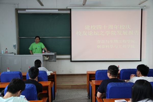 报告会上,马歌丽老师从设置专业的增多、教职工人数的增长、教学手段的变化和个人业务素质的提高四个方面详述了我院的发展历程。我院成立最初仅有食品工程系,开设食品科学与工程和烟草工程专业,而现在拥有食品科学与工程、轻工技术与工程、生物化工、发酵工程、食品工程五个硕士学位授权点,专业上有了长足的发展。另外,我院从最初仅有20多位教师成长到目前拥有130位教师,12个省部级教研平台、3个创新战略联盟产学研平台的格局。最后马老师用优秀校友的话寄语同学们:基础课程和实际动手操作能力在以后的就业和创业中至关重要。接下来姚二民教授介绍了我校发展的历史背景和最初成立的概况,我校的筹建始于1975年,