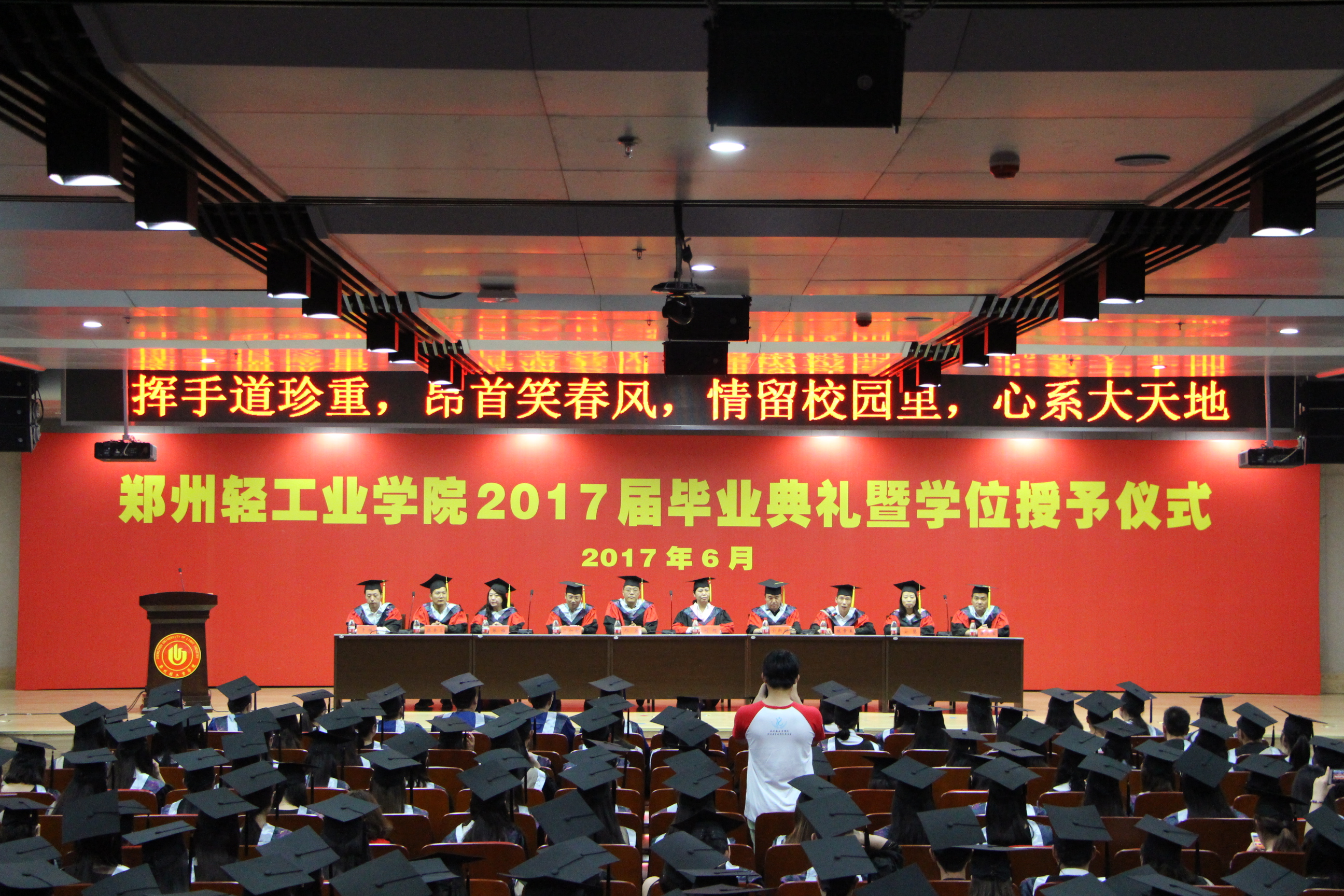 “挥手道珍爱,昂首笑东风,情留校园里,心系大天地”,踏着节奏明快的《凯旋进行曲》,34名硕士毕业生与568名本科毕业生,依次走上主席台,学院领导、导师为每一位学位获得者扶正流苏,颁发学位证书,并亲切地与学生握手祝贺、合影留念。在老师及同学们热烈的掌声中,2017届毕业生学位授予仪式圆满结束。