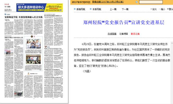 6月29日,在建党96周年到来之际,作为我校青年马克思主义研究会的指导老师,聂海杰博士以“党史报告员”的身份,受邀来到郑州高新区枫杨街道办事处,为社区居民带来了一场精彩的党史报告。报告会非常成功,被《河南日报》7月5日教育版报道。