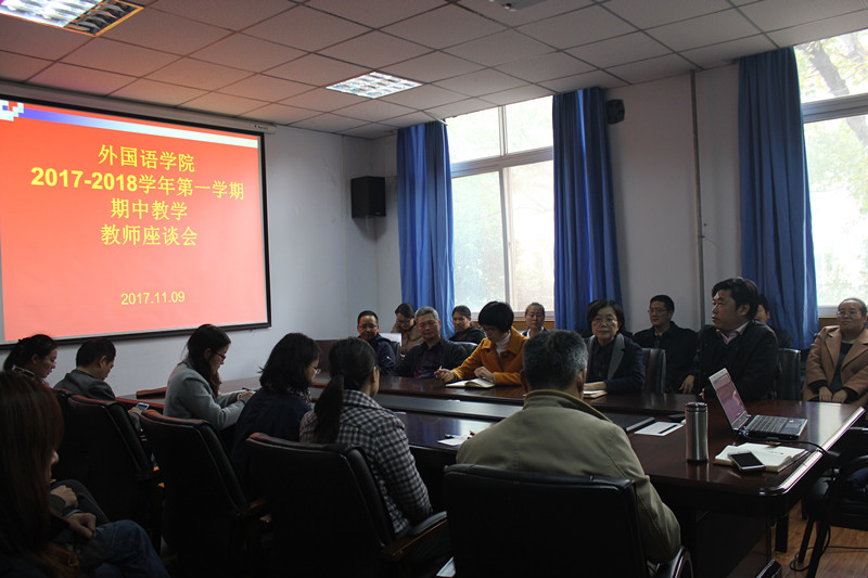 按照学校整体教学工作部署,结合院系实际情况,外国语学院于2017年11月9日下午15:00点在东二楼召开了本学期期中教学检查教师座谈会。各系部教师代表31人参加了座谈会。会议由周麦成副院长主持,陈文凯院长出席了座谈会。