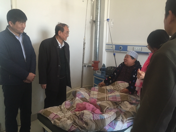 扶贫工作组首先与我校省派驻村第一书记罗楚新老师交流了帮扶对象的情况,并与当地乡、村干部一起到清水河乡中医院看望生病住院的结对帮扶对象刘振菊老人,工作组成员详细了解了刘振菊老人的病情及治疗状况,嘱咐刘振菊老人安心养病,争取早日康复出院。刘振菊老人不断地说着谢谢,感谢工作组为她带来的生活用品,感谢郑州轻工业学院对她的关爱与帮助。