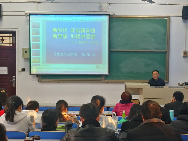 在宣讲中,杨瑞勇副教授以“新时代,开启新征程;新思想,引领中国梦”为主题,从十九大的主题和历史成果、新时代中国特色社会主义建设的总任务和战略步骤、习近平新时代中国特色社会主义思想的科学内涵和重要意义等三个方面解读了党的十九大报告,重点从“八个明确”和“十四个坚持”方面阐释了习近平新时代中国特色社会主义思想的内涵。