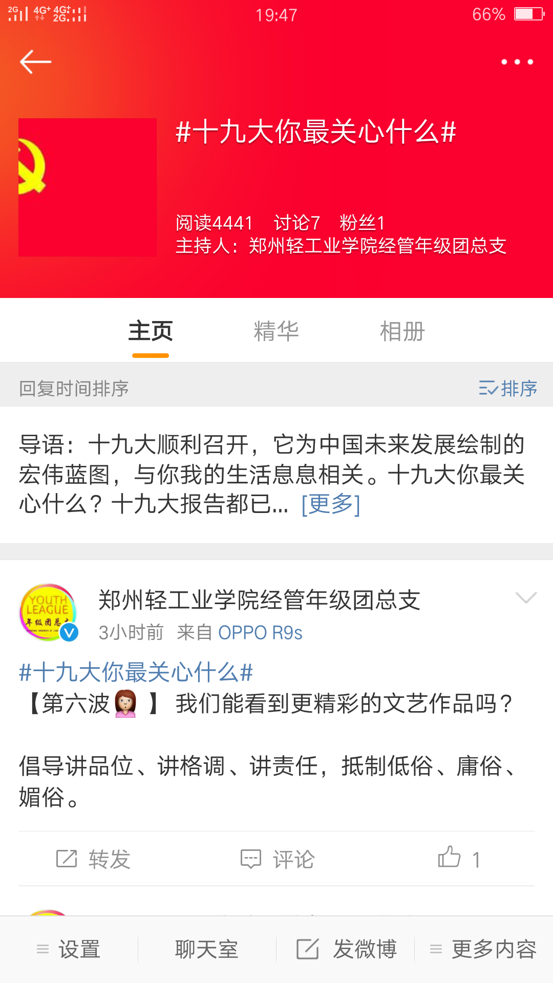 随着十九大的胜利召开,学习宣传党的十九大精神的热潮在院内迅速掀起,与此同时网络的快速发展和新媒体平台的建立与不断完善,微博微信成为了活动可依托平台。经济与管理学院为创新活动形式,让同学们更好的学习十九大精神,决定以微博话题的形式开展活动。活动内容为微博搜索话题#十九大你最关心什么#进入话题界面即可参与活动,在活动中主持人会即时为同学们回答一些“就业”“公平正义”等生活中与同学们息息相关的问题。活动开始后,同学们积极的参与互动,学习十九大的精神,使同学们在网络浏览的同时对十九大内容有了更深的理解。
