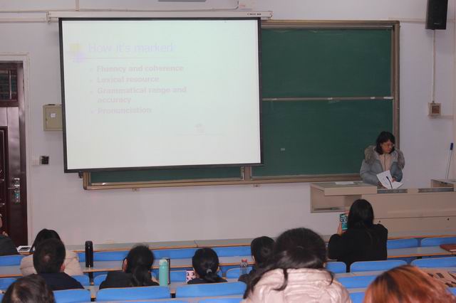 近年来,我院先后有4位教师参加了北京语言大学和英国文化教育协会联合举办的雅思官方培训。首先,夏冰老师简要介绍了雅思听力的话题、题型及评分标准,提供了丰富的听力材料、资源获得渠道,并结合自身大学英语教学实践阐述了听力教学策略,启发教师们尝试多样的听前、听中、听后活动设置,以此改变课堂形式、激发学生主动性、提高学生兴趣。潘晓瑜老师基于雅思阅读题型特点,重点介绍了新颖的阅读教学技巧(如“Hot Seat”、“Jumbled Sentences”等)。她参照雅思课堂辅导环节,提出在大学英语课堂教学中分析学生需求、诊断学生问题从而提高学生阅读能力的具体措施(识别标志性单词;建立文本阅读以及结构分析意识、元认知意识)。崔萍萍老师介绍了雅思考试写作形式、话题类型、评分准则等,提出以测促教,有的放矢,并在教学实践中实施话题提纲草拟、限时写作训练等教学策略。吴智慧老师介绍了雅思口语考试基本情况,提出教师需要结合自身教学,因材施教,帮助学生诊断问题,并对其采取相应训练。鉴于学生写作中流水句、碎片句较多这一现状,基于布鲁姆的认知理论,她对读写译教学活动的设置进行了探索,借助引导学生评论课本内容、分析个人及同伴句式等方式,促进了学生自主学习能力的提高。