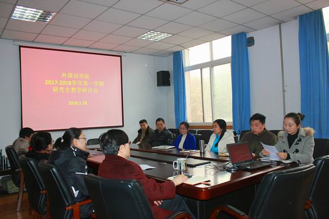 1月18日下午,外国语学院在东二楼306召开本学期研究生教学研讨会。会议由边铀铀副院长主持,学院硕士生导师、研究生专业课任课教师以及研究生秘书共12人参加了本次会议。