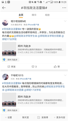 为了传承雷锋精神,弘扬雷锋文化,打造互助和谐的校园文化,培养学子们互助和谐,助人为乐的美好品质。政法学院于3月25日——28日在微博线上开展寻找身边的雷锋活动。政法学院部分学生参与此次活动。