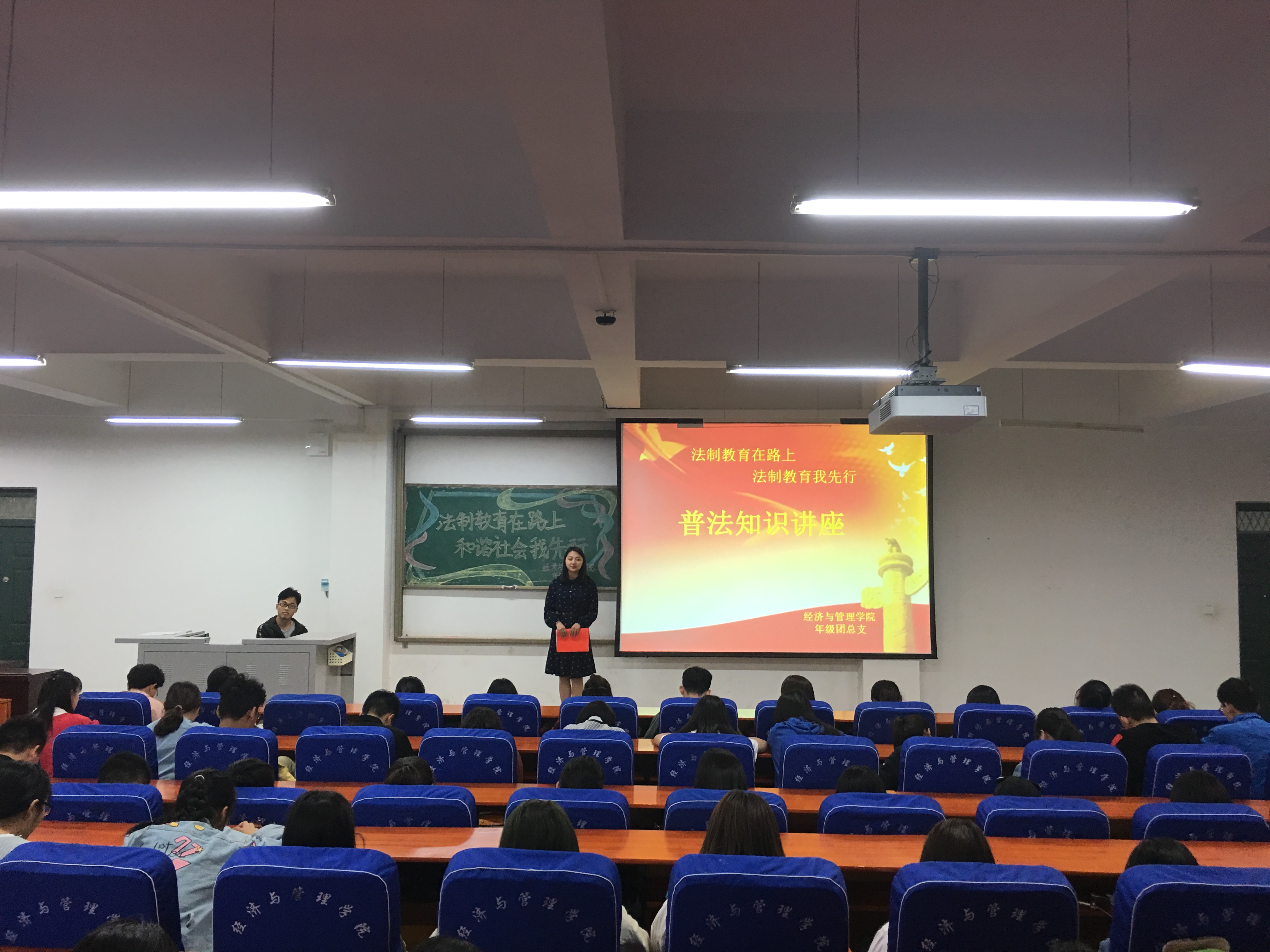 为增强我院学生的法律意识,维护校园及社会的稳定,推进法制建设,经济与管理学院于2018年4月23日下午18:30在经管楼211举办了以“法制教育在路上,和谐社会我先行”为主题的普法教育活动。我院17级100余名学生代表参加了此次活动。