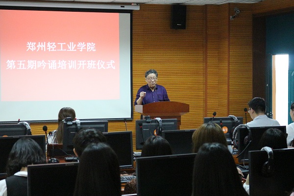 仪式上,河南省吟诵学会会长华锋教授介绍了全国及河南省开展吟诵活动的情况,充分肯定我校在吟诵学术理论研究、文化传承推广中做出的杰出贡献,勉励同学们弘扬优秀传统文化,吟诵经典,传习雅言,培育君子之风。校党委宣传部副部长刘磊老师深刻阐述了优秀传统文化在社会主义核心价值观宣传教育中的作用,希望各位学员珍惜机会,坚定文化自信,以吟诵这把钥匙打开古典诗词的大门。