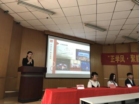 活动开始,陈璐老师指出了宣讲会的目的和意义,她强调希望通过选树典型和朋辈帮扶的方式,让优秀成为一种习惯,让奋斗成为青春的底色。随后,宣讲团成员赵鸿丹、王欣慰、史欣、刘畅四位同学依次以《怀揣梦想·勇于前行》、《不忘初心·砥砺前行》、《以梦为马·不负韶华》、《奔跑吧!青春》为主题进行优秀事迹宣讲。他们的事迹有的感人至深、有的励志向上、有的干货满满,赢得了现场观众的阵阵掌声。