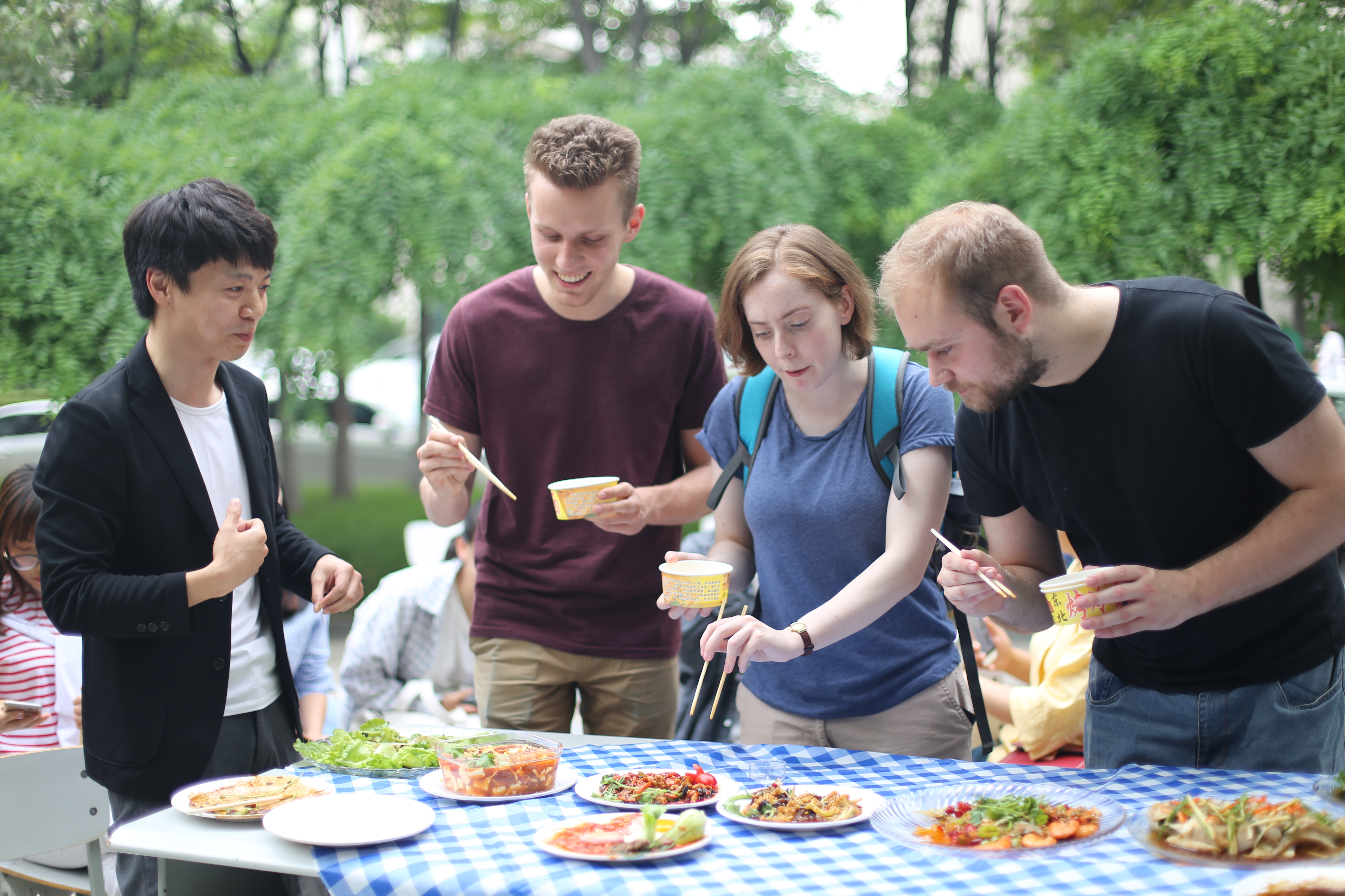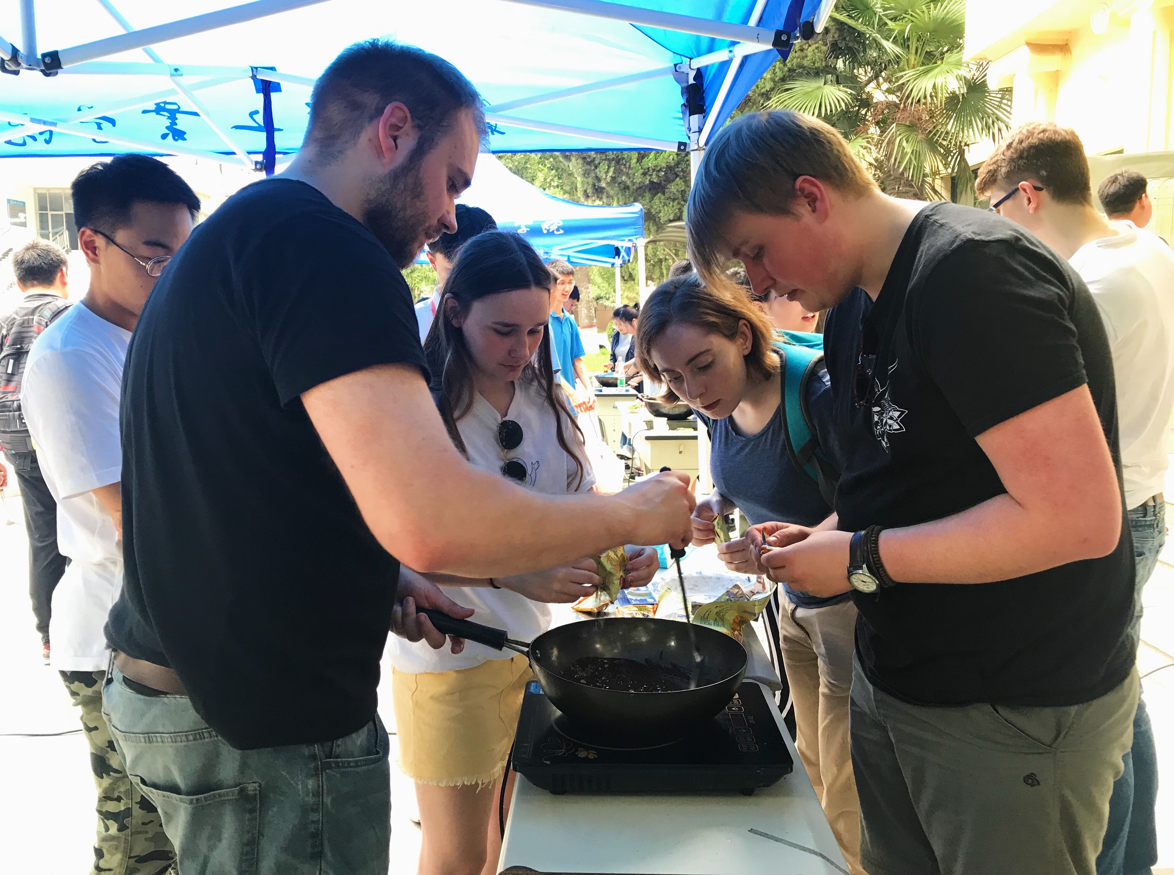 品中外美食,学趣味英语,享中外文化。国际教育学院于5月24日下午在秋实园举办了“舌尖上的IEC——中外学生厨艺交流大赛”。学院党总支副书记李锐杰老师、英语教学部老师、辅导员老师和留学生代表们共同参与了本次活动。