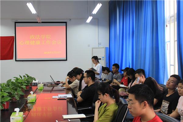 为加强学生心理健康教育工作,营造人人关注心理健康的氛围,提高学生心理调适能力,政法学院于2018年5月23日中午13:30在政法学院212召开心理健康工作会议,本次会议由匡竞老师主持,政法学院党总支副书记金亮出席,各班班长、团支书、心理健康委员,及学生会心理部成员参加了此次会议。