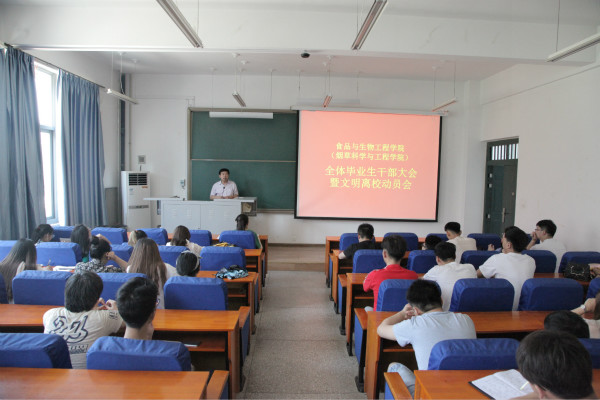 2018年6月12日下午2点,食品与生物工程学院(烟草科学与工程学院)在食工楼209教室召开了全体毕业生干部大会暨文明离校动员会。我院党总支书记吴占超老师、全体辅导员老师、全体硕士及本科毕业生党员、学生干部参加了此次会议。