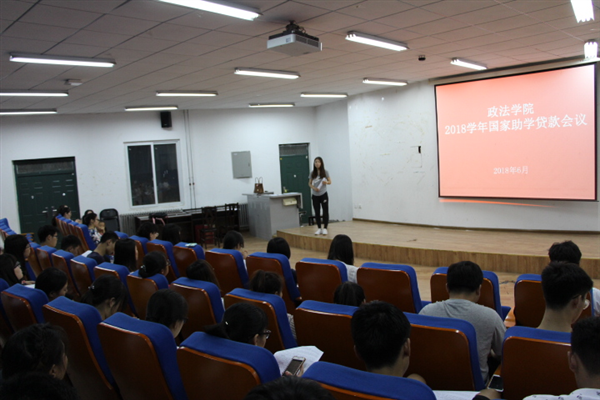 为进一步宣传国家资助政策,做好我院2018年国家助学贷款工作,帮助家庭经济困难学生顺利完成学业,政法学院于2018年6月19日晚上8:00在政法楼模拟法庭112室召开2018年助学贷款政策宣讲会,会议由学工办刘栩静老师主持,各年级学生干部代表、宿舍长及2018年拟贷款学生参加了此次会议。