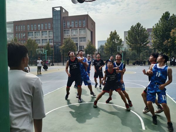 中午12点,艳阳高照,球员们已经到场做着准备活动。随着裁判的哨响,整个球场充满了紧张的气氛,队员们的激情淋漓尽致的体现在篮球场上。比赛进程中,各位队员都全力以赴,用心防守、有力阻挡,越战越勇。由各班同学组成的啦啦队也情绪高涨、摇旗呐喊,不时为队员加油打气,气氛热烈。赛场上双方拼抢激烈,带球、运球、投篮等一系列动作潇洒、规范,引来围观同学一阵阵地喝彩。每位队员都用心跑位,为队友作掩护,还时不时有精妙的传球、漂亮的配合和精彩的上篮。比赛中也有失误,但是并没有因此影响了比赛情绪,大家在不断调整中进步。