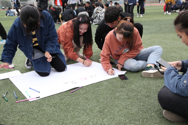 在工作人员的组织协调下,素质拓展有序开展。此次活动共有三个项目:“松鼠与大树”、“选队名,唱队歌,画队旗”和“千牵结”。“松鼠与大树”作为破冰环节充分调动了同学们参与活动的积极性,让同学们通过游戏的方式相互熟悉彼此,打开心扉,放松心情,从而更愉悦地参与接下来的活动。“选队名,唱队歌,画队旗”活动是让成员之间更加地熟悉彼此,锻炼了同学们的团队协助能力,从而到达提高身体与心理素质。“千牵结”活动是全部成员共同完成的一项游戏,这项游戏使大家在活动中更加拉近了彼此的距离,感受到团体的魅力。最后同学们围圈而坐,一起分享这次活动的感想感悟,通过自我总结,进一步提高同学们的身心素质。