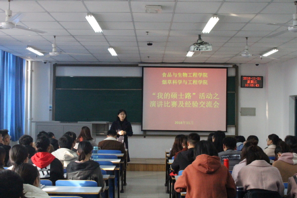 为进一步学习贯彻习近平总书记在全国教育大会上的重要讲话精神,增强2018级研究生科学规划职业生涯意识,食品与生物工程学院(烟草科学与工程学院)于2018年11月21日在二教楼812举办了第五届“我的硕士路”演讲比赛及经验交流会。研究生辅导员马瑞静老师及2018级全体研究生参加了此次活动。