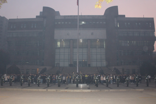 2018年11月26日清晨,机电工程学院在图书馆广场前举行升旗仪式暨“铭记‘一二·九’,共舒爱国情”主题教育,机电工程学院分团委马宇老师及全体2017级、2018级学生参加了此次活动。