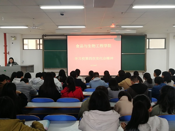 为深入学习宣传贯彻学校第四次党代会精神,加强思想文化建设和团组织建设工作,食品与生物工程学院(烟草科学与工程学院)于11月24日在科学校区二教楼816教室开展了以“学习宣传贯彻学校第四次党代会精神”为主题的团日活动。食品质量与安全17-01,17-02班全体学生参加了此次团日活动。