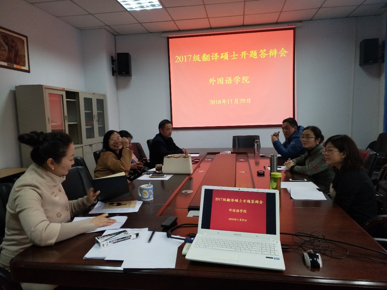 11月28日下午,外国语学院在东二楼306召开2017级翻译硕士开题答辩会。本次座谈会由边铀铀副院长主持,开题报告评议小组全体老师参加。