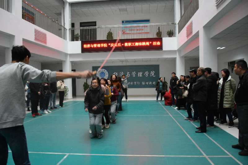为积极开展群众性体育活动,庆祝元旦节,2018年12月27日下午3:30,经济与管理学院分工会在科学校区经管楼大厅举行了“庆元旦·教职工趣味跳绳”活动。