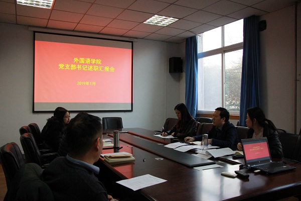 2019年1月17日,外国语学院党总支在东二楼306会议室召开2018年度党支部书记述职汇报会。学院副书记孔祥娟、全体党支部书记参加会议。会议由党总支书记王伟主持。