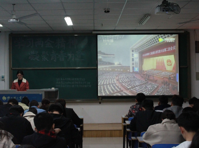 活动中,同学们首先观看了中华人民共和国第十三届全国人民代表大会第二次会议和中国人民政治协商会议第十三届全国委员会第二次会议开幕式,先后聆听了政府工作报告和全国人大常务委员会工作报告,为过去一年我国在经济社会发展、发展新动能、打好三大攻坚战、改善人民生活等方面取得的成就感到欣喜,对实现2019年政府工作任务充满信心。接着,团员代表带领同学们重点学习了报告中与大学生相关的就业创业问题,切实感受两会带给我们的改变。最后,同学们围绕教育、就业、文化文艺、哲学社会科学、全面建成小康社会等热点话题展开热烈讨论,结合自身以及周边情况发表自己对热点问题的看法,畅谈祖国发展,了解国家民生大计。