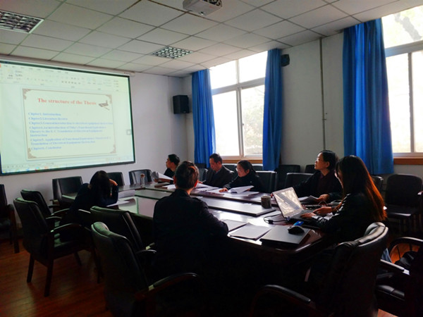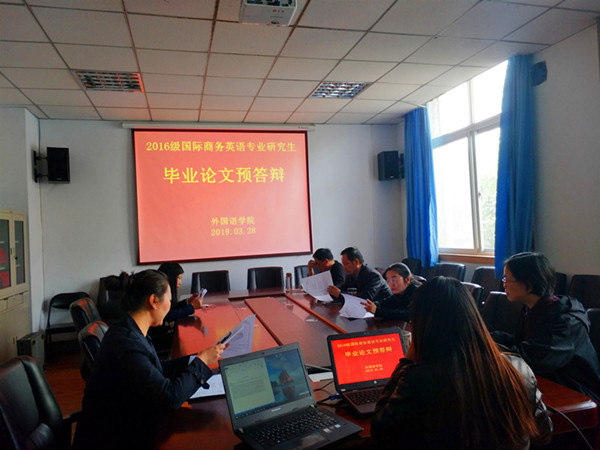 3月28日下午,外国语学院2016级国际商务英语硕士研究生在东二楼306进行毕业论文预答辩。预答辩会由边铀铀副院长主持,陈文凯院长担任评审组长,李秋霞、闫朝晖、陈甜、赵祥云等导师担任评审组成员。