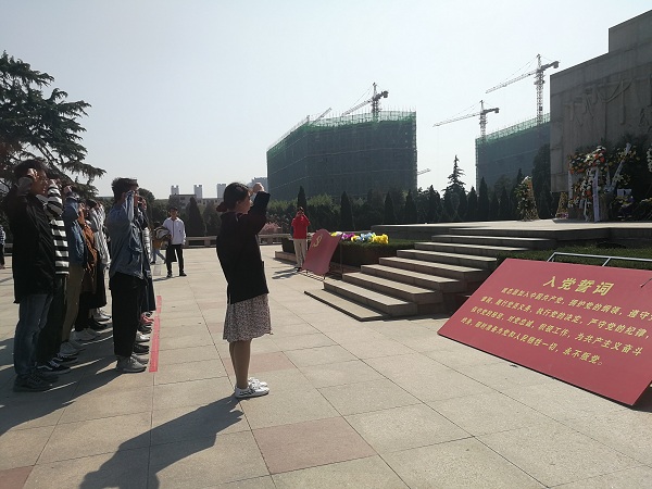 上午9时,全体同学在纪念碑前默哀追思,默哀毕,2名同学代表手捧鲜花,缓步走向革命烈士纪念碑,并将鲜花庄重安放于碑前。预备党员面向党旗进行入党宣誓,团员代表也重温了入团誓词,庄严的誓词回响在陵园的上空。随后,全体人员面向纪念碑三鞠躬,并缓步绕行,瞻仰革命烈士纪念碑,追思革命先烈不朽功绩,向烈士表示深切缅怀和崇高敬意。