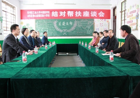建设、师资培训、设备更新等。陈文凯院长介绍了外国语学院的基本情况,特别就师资培训和暑期支教等方面做了重点沟通。王伟书记表示会尽全力支持和帮扶泰山庙镇实验学校,送教下乡,送智下乡,为办学水平提升和学校发展贡献一份力量。朱晓东副县长代表泌阳县政府表态,扶贫先扶智,泌阳县一定大力支持教育工作,为双方结对帮扶牵线搭台、创造条件;他强调指出,外国语学院有着人才资源优势,可在思想引领、专业建设和师资培养方面给予当地支持和帮助,以点带面,提升泰山庙镇中小学整体教育教学水平。