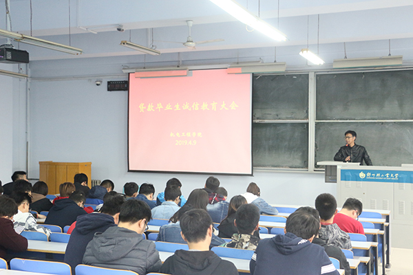 为进一步推进贷款毕业生还款工作,教育和引导学生树立诚信、自强、感恩意识,2019年4月9日中午,机电工程学院在东一楼200召开2019届国家助学贷款毕业生诚信教育大会,我院贷款负责老师和2019届国家助学贷款毕业生参加了本次大会。