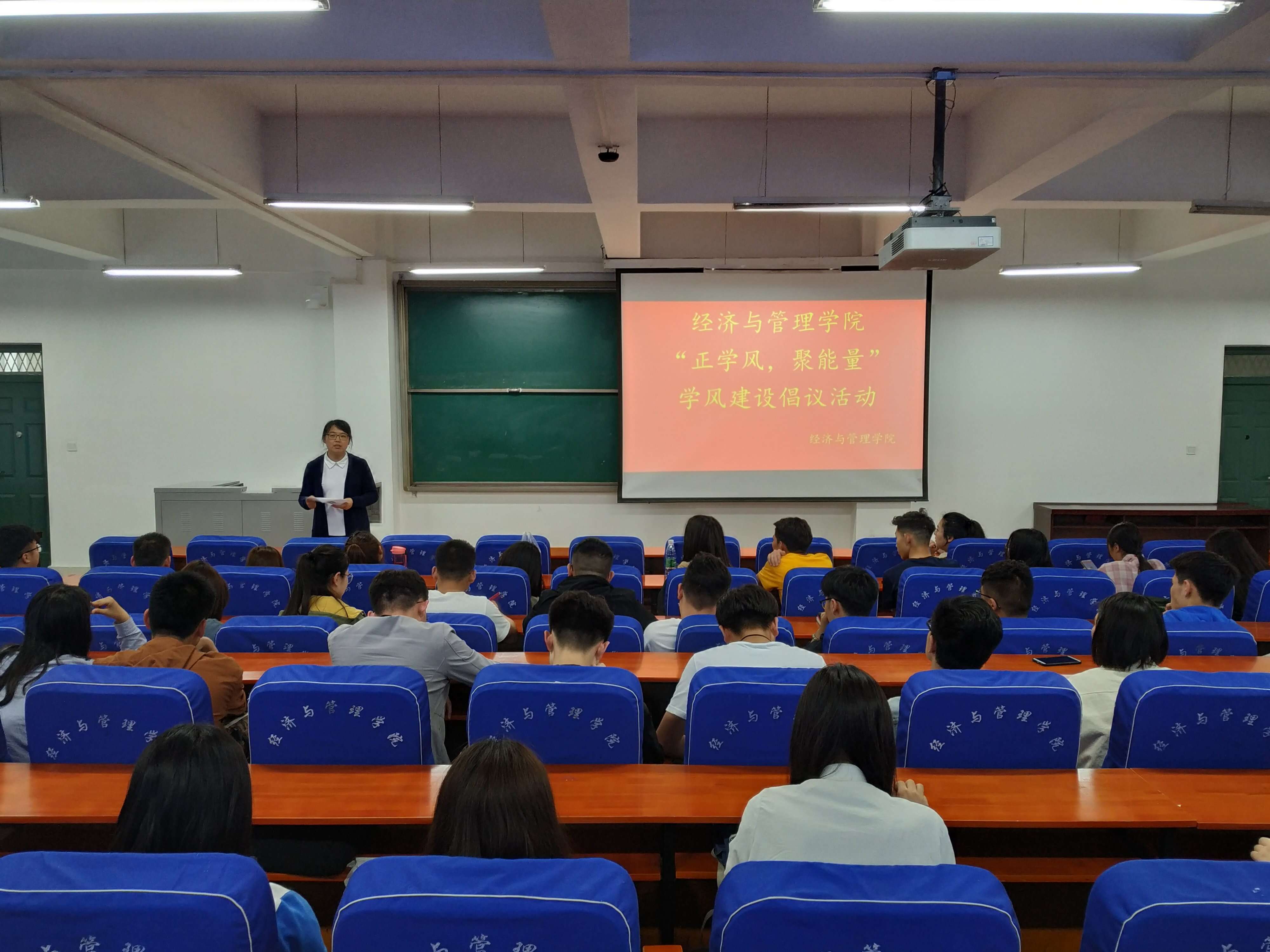 为进一步巩固和发扬优良学风,经济与管理学院于4月28日中午1点在经管楼211举办“正学风 聚能量”学风建设倡议活动,由学院辅导员陈莉洁老师主持此次活动,100余名各班班委及班级代表参加此次活动。