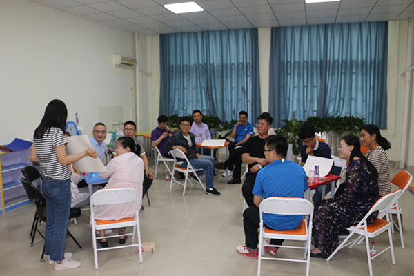 活动包括同舟共济、认识自己二十问、小组共做画、命运之牌、盲人之旅五个环节。“同舟共济”作为暖场活动,胡新月老师将班主任进行了分组,要求每组成员都要想办法共同站立在一块纸板上,通过团队协作增进彼此的熟悉程度;接下来“认识自己二十问”,通过二十个直面心灵的问题帮助组员认识自我、关注自我进而接纳自我;“小组共做画”通过组员共同创作一幅画,帮助老师体验人际关系,尤其是和学生相处中言语和非言语交流的重要性;“命运之牌”以再选命运的形式鼓励各位老师接纳自我,同时也提升班主任的同理心,从而设身处地的理解学生、帮助学生;“盲人之旅”增加了对他人的信任与接纳,倡导各位老师作为学生的“引路人”应积极建立师生之间信任,培养良好的师生关系。活动在一片欢声笑语中结束。