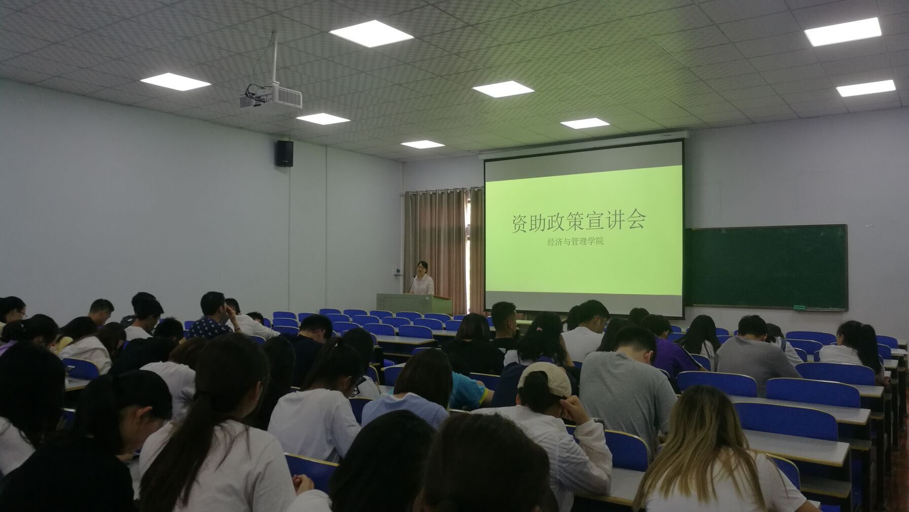 会上,陈莉洁老师给同学们详细介绍了“奖、贷、助、补、减”和“新生绿色通道”六位一体的资助体系,包括各项资助政策的主要内容、申请条件、资助金额、如何申请办理等方面。之后,她强调受助学生一定要合理使用奖助学金,诚信做人,心怀感恩之心,努力学习,早日回报社会和国家。会后,学生对于单项奖学金、退伍士兵入学等问题进行咨询,陈老师一一回答。