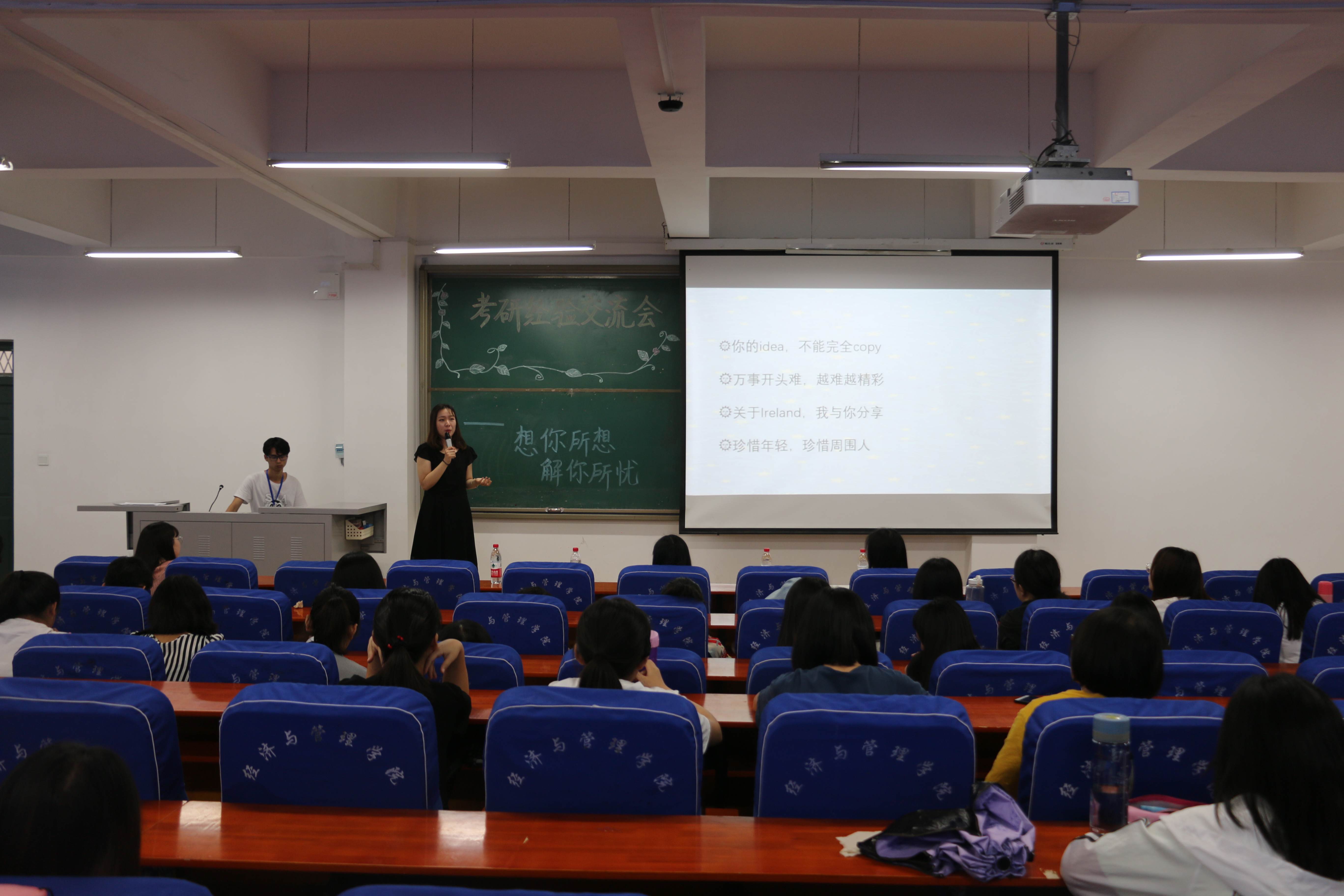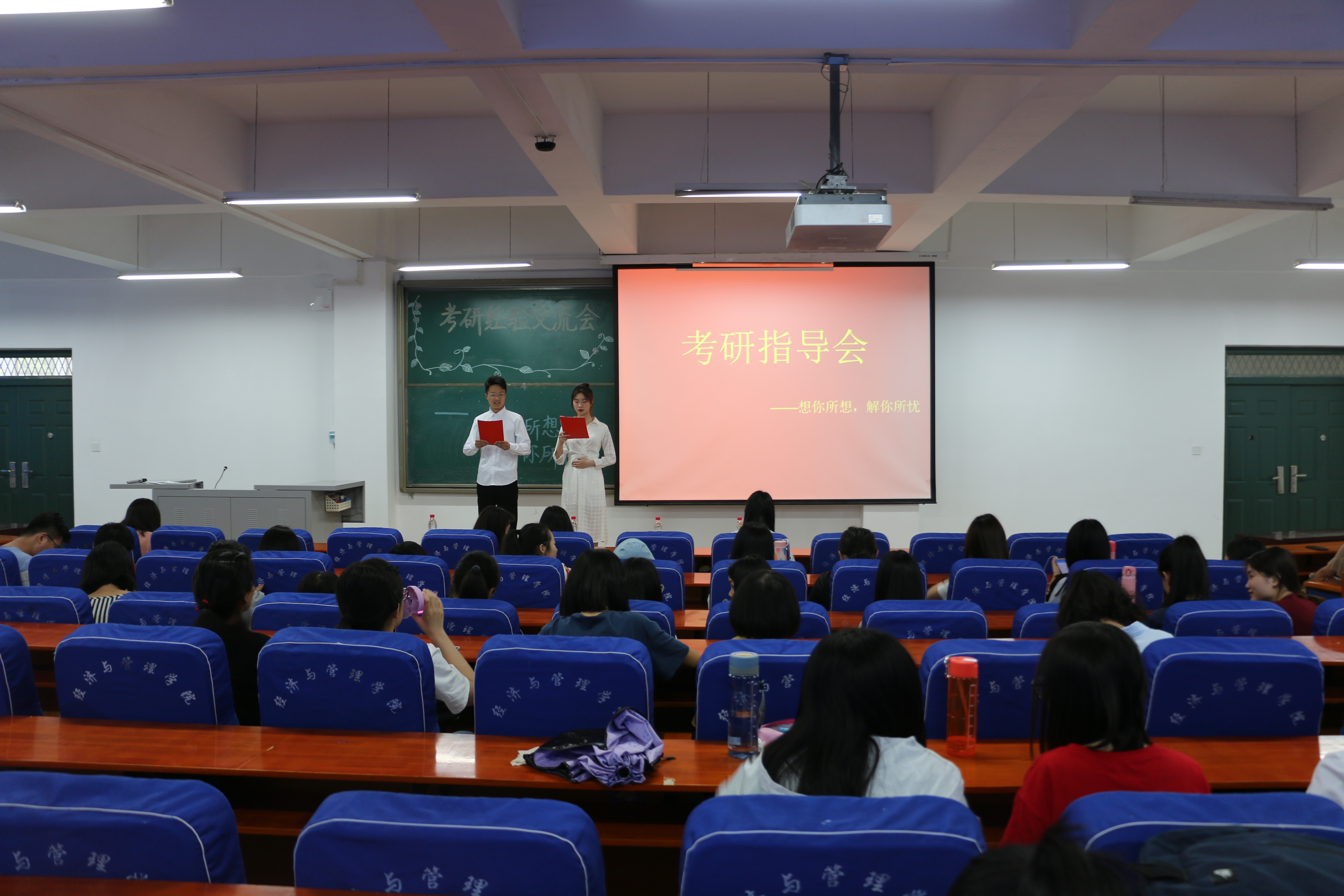 为了进一步加强我院学风建设,给有意向考研的学子们提供更多的考研经验,经济与管理学院于2019年5月29日下午1点在经管楼211举办了考研经验交流会。本次交流会有幸邀请到了郭倩倩、逄雨昕、赵坤莹以及刘纠纠四位在今年均以优异的成绩成功考研或出国留学的嘉宾为同学们讲述自己的考研经验。