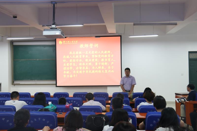 为引导新入职教师树立崇高职业理想,增强立德树人的责任感和使命感,进一步加强教师队伍师德师风建设,提高教师思想道德素质和师德修养,引导广大教师自觉践行社会主义核心价值观,争做“四有”好老师,经济与管理学院于6月6日下午在经管楼211室组织开展了教师宣誓活动,会议由党总支书记张云超主持。