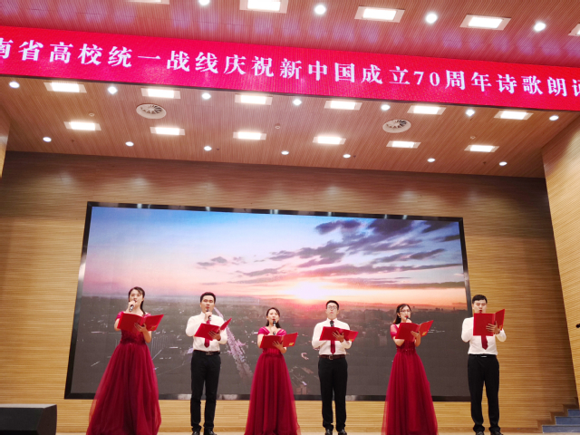 本次诗歌朗诵会由中共河南省委高校工委、河南省教育厅主办,郑州航空工业管理学院承办,以庆祝新中国成立70周年为主题,坚持以习近平新时代中国特色社会主义思想为指导,以诗歌朗诵会的形式讴歌新中国成立70年来我国取得的伟大成就,展现了全省高校广大统战成员的良好精神风貌,凝聚了全省高校统一战线力量,激励了广大统战成员为实现中华民族伟大复兴的中国梦砥砺奋进,再创辉煌!