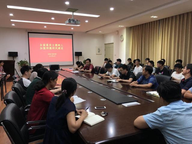 为进一步加强研究生培养质量,落实教育部“三全育人”和立德树人职责, 2019年6月27日下午15:30,机电工程学院在西三楼215 会议室召开“全面落实立德树人、加强师德师风建设”会议。机电工程学院副院长肖艳秋、研究生导师、研究生辅导员及全体研究生参加了此次会议。