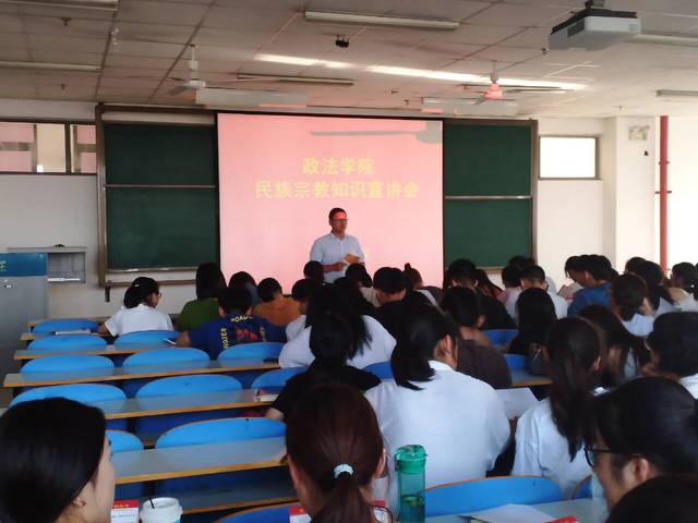 9月7日9:00,政法学院在二教楼816室组织开展民族宗教知识宣讲会,2019级新生150人参加宣讲会。