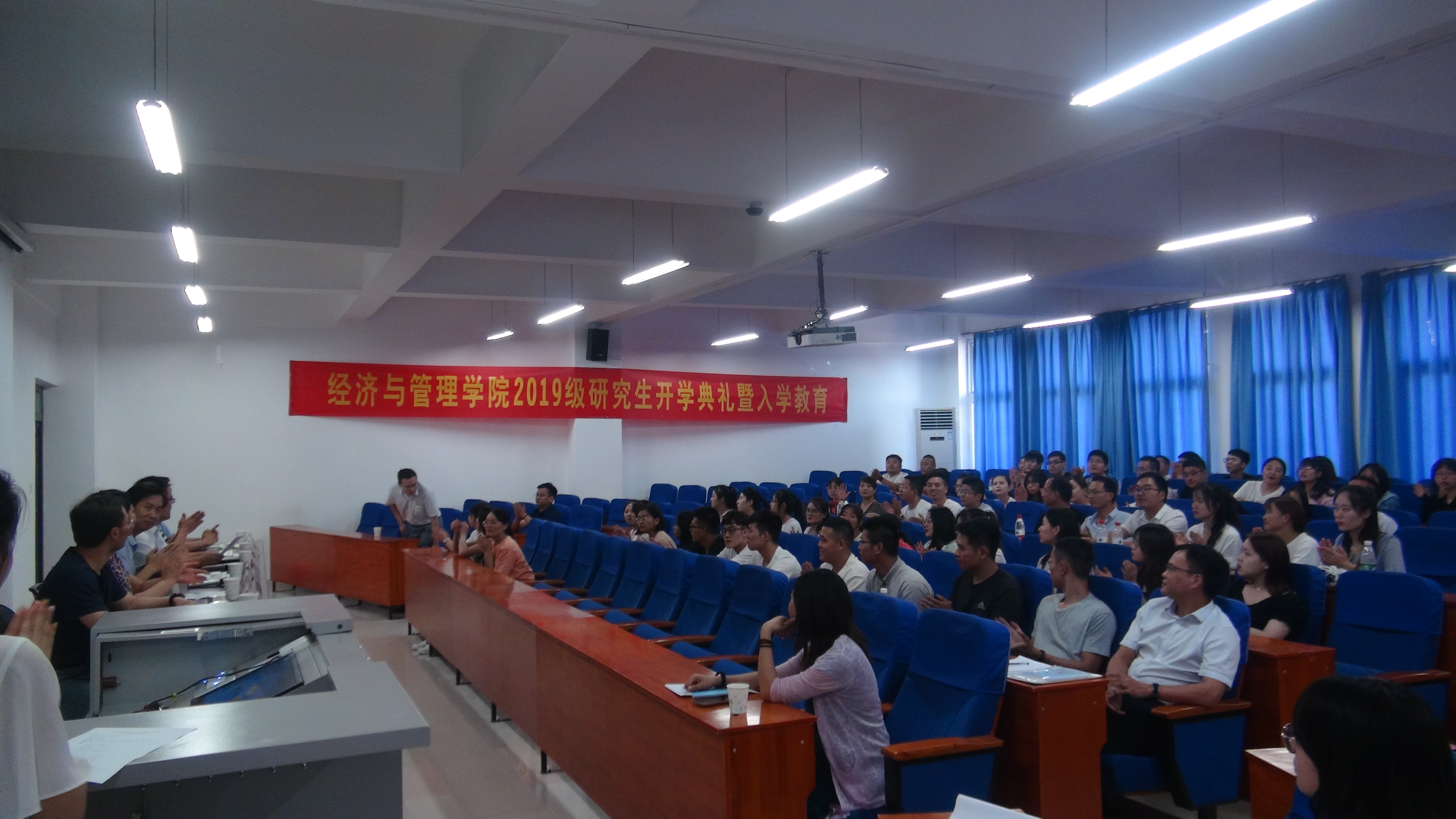 2019年9月5日下午,经济与管理学院2019级研究生开学典礼暨入学教育大会在经管楼211教室隆重举行。校党委研工部副部长、校研究生处副处长段龙江和学院领导张云超、刘珂、陈章美、符加林出席会议。学院研究生管理办公室、MBA和MPAcc项目中心老师,研究生导师代表及2019级全体研究生参加会议。会议由学院党总支书记张云超主持。
