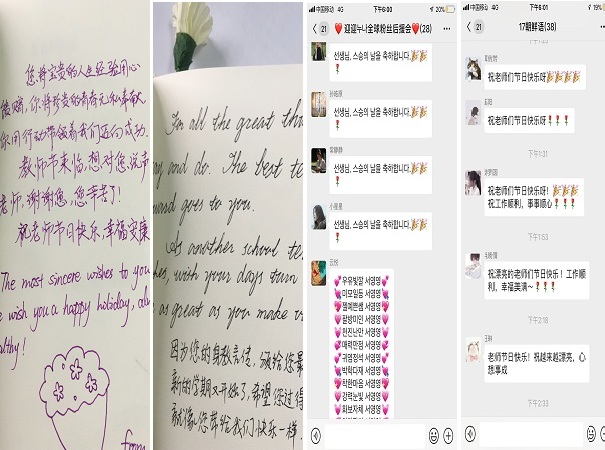 秋菊逸彩,硕果飘香,在秋韵荡漾的日子里,外国语学院为辛勤奋战在一线的教师送去鲜花祝福,学生们也纷纷以自己的形式表达对老师的敬意。