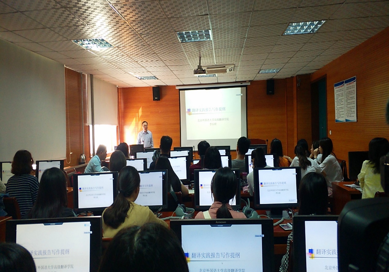 9月23日上午,北京外国语大学高级翻译学院副院长李长栓教授应邀为外国语学院师生做了题为《在翻译实践报告中体现翻译实践能力》的学术讲座。讲座由外国语学院院长陈文凯教授主持,翻译硕士研究生导师和全体翻译硕士研究生参加了讲座。