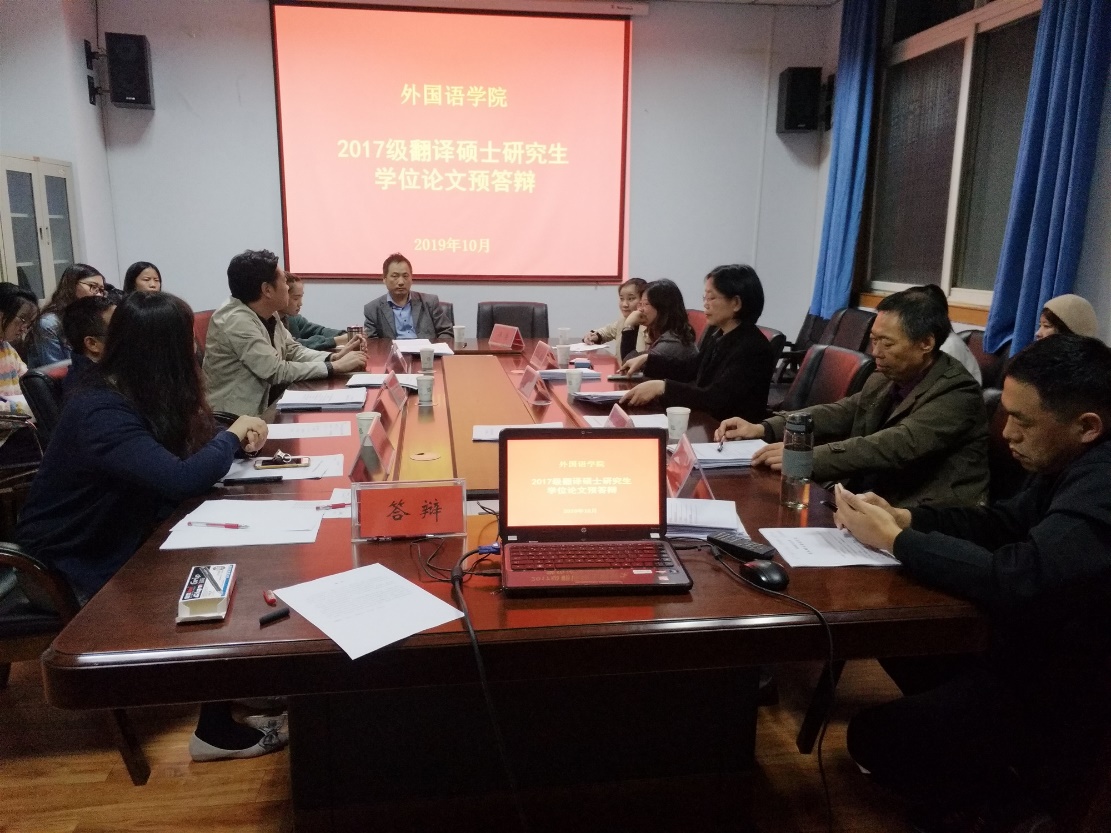 10月11日下午,根据我校研究生处工作安排,外国语学院在东二楼306组织2017级翻译硕士英语专业研究生学位论文预答辩。预答辩由边铀铀副院长主持,陈文凯院长担任预答辩主席,河南师范大学外国语学院张志强教授受邀担任校外专家,周麦成、闫朝晖、聂韶峰、赵祥云、和亚楠等硕士生导师担任评审组成员。