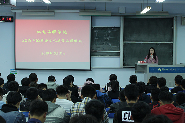 为了进一步推进宿舍文明建设,增加宿舍成员的凝聚力和创新能力,展现我院学生积极向上的精神风貌,活跃我院宿舍文化氛围,2019年10月31日下午5点,机电工程学院在东一楼200举办2019年6S宿舍文化建设启动仪式,机电工程学院分团委书记孔馨雨老师、各年级寝室长参加了本次活动。