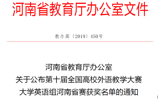 我校外国语学院参赛的崔萍萍、刘笑千和王碧瑶等三位老师凭借扎实的基本功、先进的教学理念、出色的教学设计、丰富多样的教学方法,经过多个环节的展示与比拼,分别荣获第十届“外教社杯”全国高校外语教学大赛决赛(河南赛区)综合组二等奖、听说组二等奖、微课组二等奖(详见“河南省教育厅办公室关于公布第十届全国高校外语教学大赛大学英语组河南省赛获奖名单的通知”教办高〔2019〕450号) 。