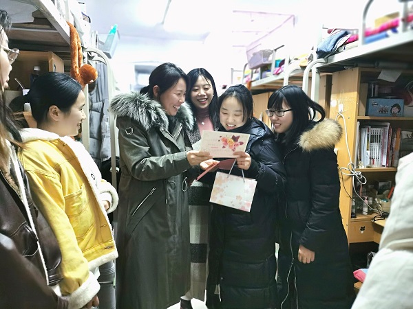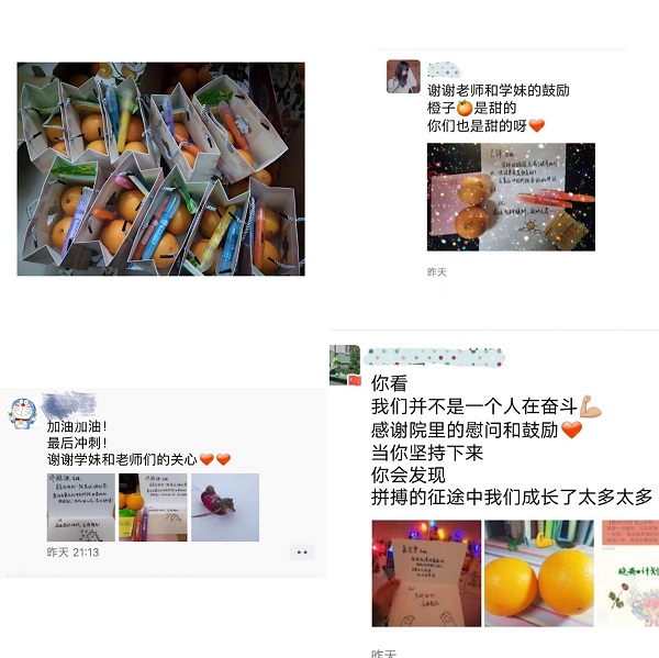 走访过程中,孔祥娟老师向毕业生了解就业和考研中的难题,传达了学院对大家的鼓励和慰问。一是轻装简行,调整状态。经过三年多的专业知识准备,到了考研冲刺期,最重要的反而是心态。二是注意安全,保持健康,顺利完成便是成功。学弟学妹们为每一位考研同学送上了文具、水果和亲手写的祝福卡片。毕业生激动感谢学院老师的关心,并表示将全力以赴,以优异成绩回报学校和老师的期盼。笑谈中毕业生纷纷寄语学弟学妹们要合理规划目标,以奋斗书写四年大学时光。